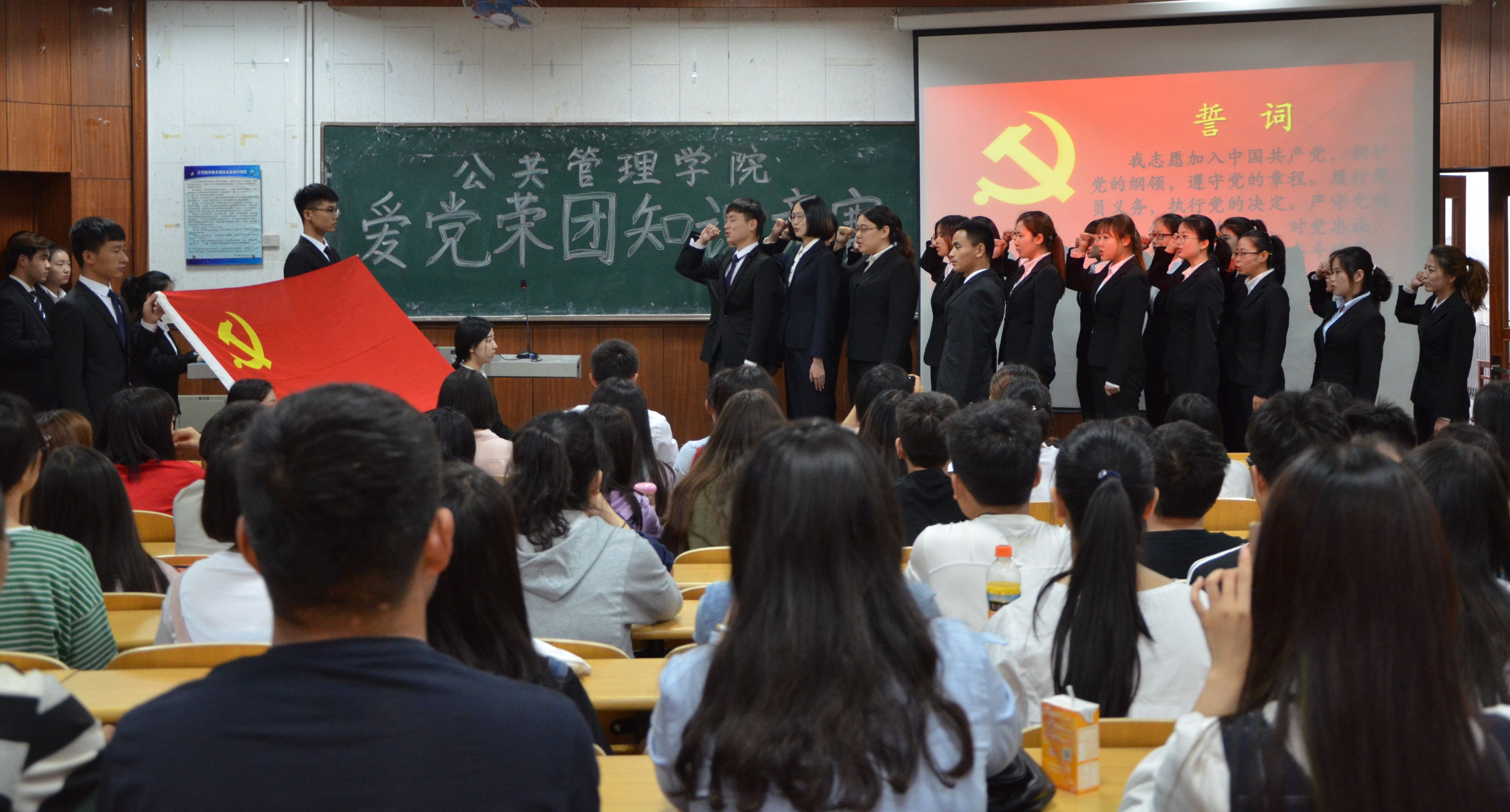 5月3日下午,伟德国际VICTOR1946在三教110教室举行了“爱党荣团”知识竞赛暨新党员宣誓仪式。伟德国际VICTOR1946辅导员孙瑶、沈洁、本科党支部书记莫振华、员工党建工作办公室祝文英、团委胡新悦担任评委。2016级150余名团员青年参加。