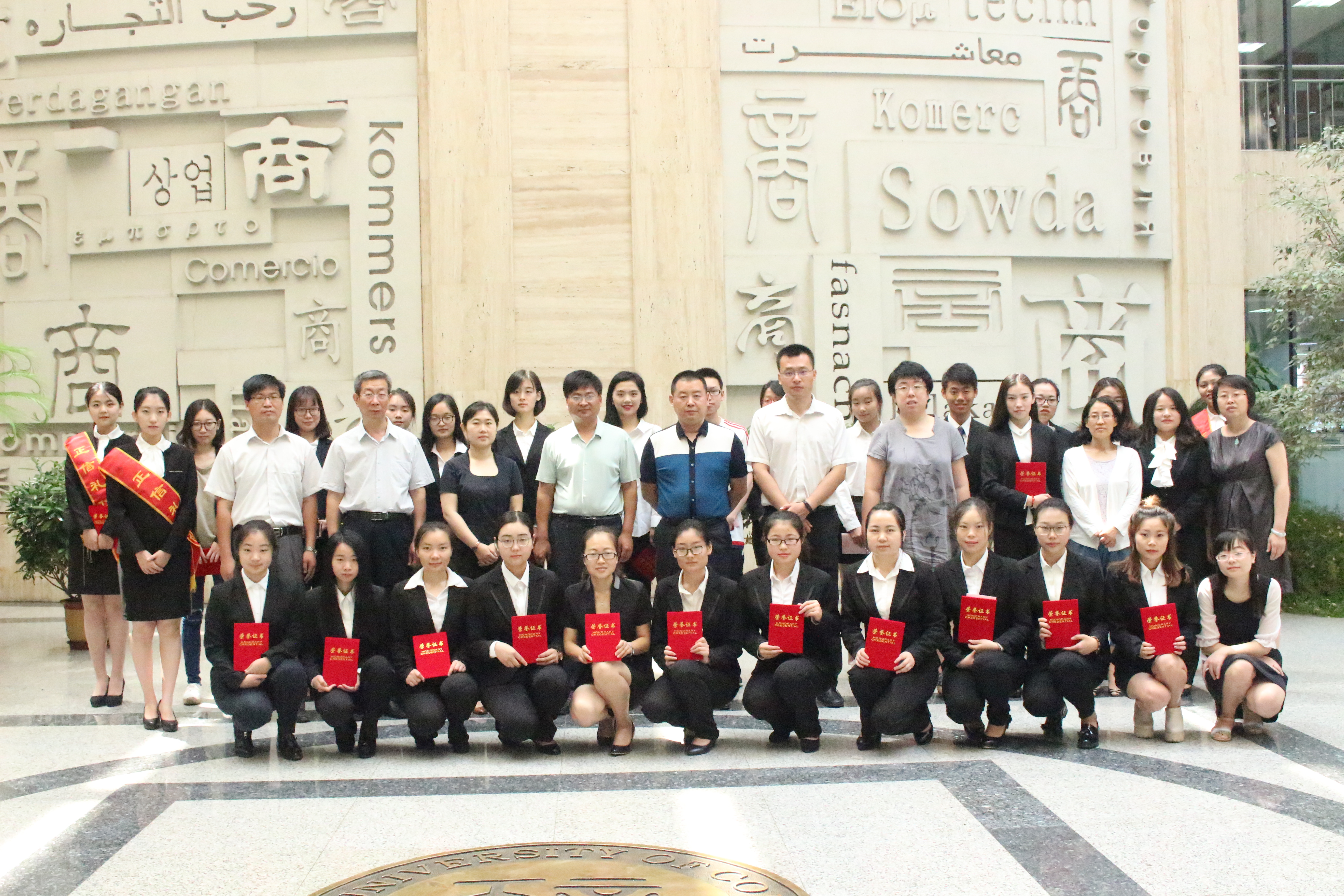 颁奖典礼结束,正信集团领导、公司领导、各专业老师及获奖同学到商字墙前合影留念。
