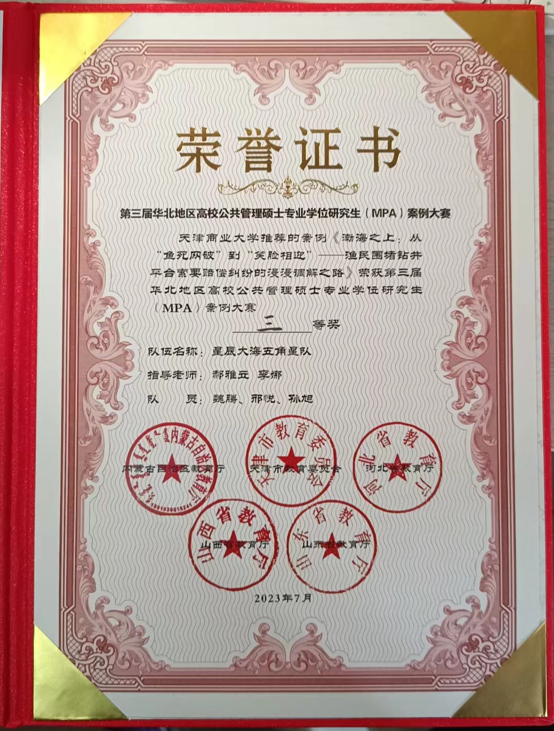 7月29日,第三届华北地区高校公共管理硕士专业学位研究生(MPA)案例大赛决赛在呼和浩特市举行,由公司伟德国际VICTOR1946郝雅立老师、李娜老师指导的,公共管理2022级学术型硕士魏腾,专业型硕士邢悦、孙旭三位同学组织的团队案例《渤海之上:从“鱼死网破”到“笑脸相迎”——渔民围堵钻井平台索要赔偿纠纷的漫漫调解之路》荣获大赛三等奖。