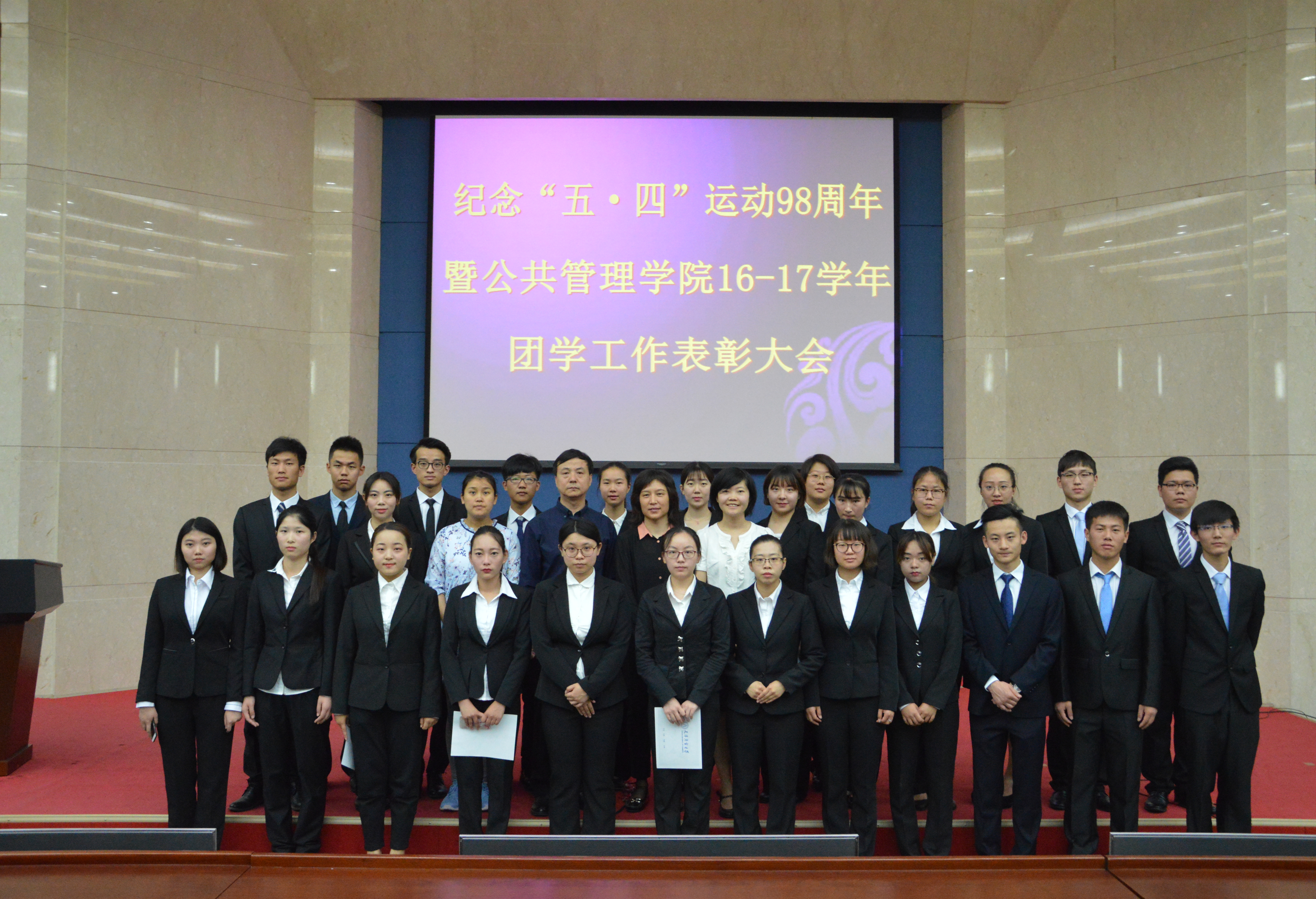 为弘扬“五·四”精神,表彰先进,树立典型,5月12日上午,伟德国际VICTOR1946纪念“五·四”运动98周年暨2016-2017学年度团学工作表彰大会在图书馆学术报告厅召开。公共管理公司党委书记白洪文、党委副书记刘均玲、辅导员孙瑶、仉雅琼出席会议,获奖代表、员工干部和2016级员工代表参加会议。会议由辅导员沈洁主持。
